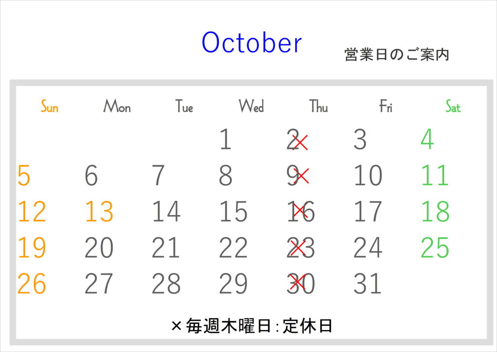 10月の定休日のお知らせです。