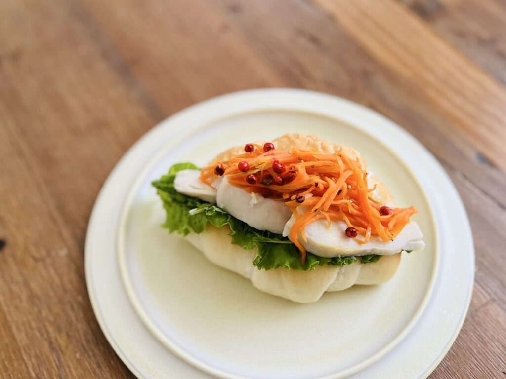 さっくりした歯ざわりの塩パンにサラダチキンとたっぷりの自家製キャロットラぺをサンドして、