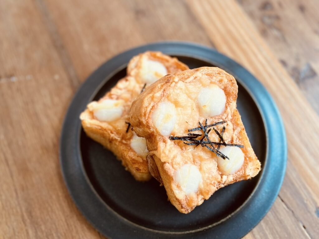 小型で焼き上げた食パンにフレンチ液を浸して、表面に明太バターを塗り米粉で作ったお餅と
