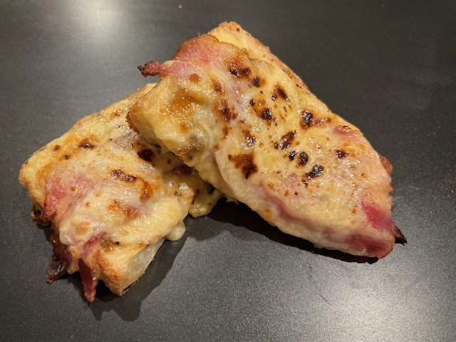 自家製のベシャメルソースにベーコン・ウインナーをのせました。