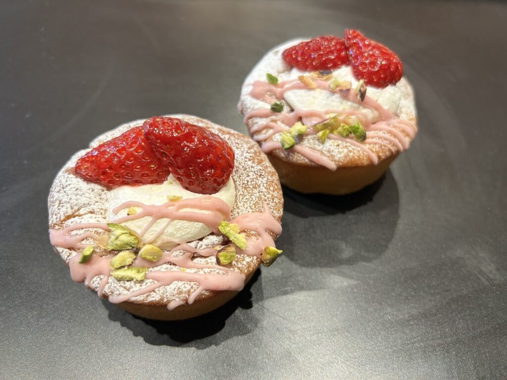 仕上げにホイップクリームを絞り、アーモンドダイスとピスタチオを散らして、食感と彩りをプラス。