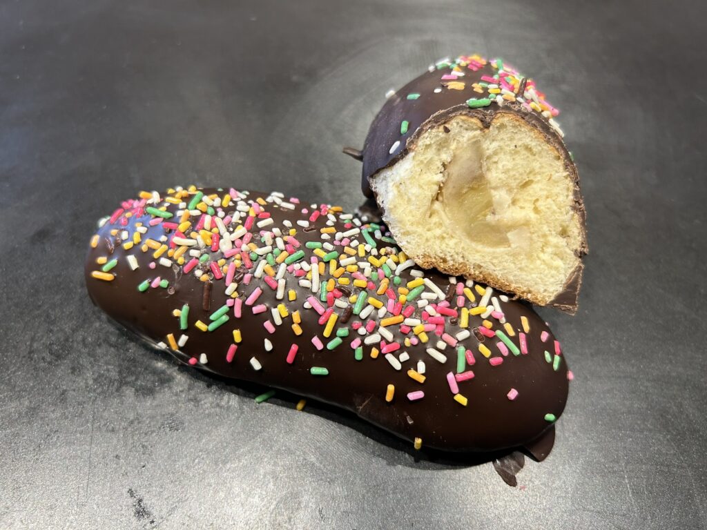 バナナクリームとフレッシュバナナを包んで焼き上げ、全体をチョコレートでコーティングしました。